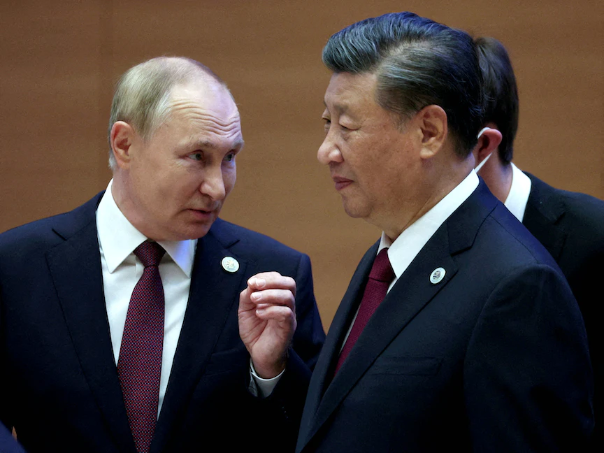الرئيس الروسي فلاديمير بوتين يتحدث مع الرئيس الصيني شي جين بينج قبل اجتماع لرؤساء الدول الأعضاء في قمة منظمة شنغهاي للتعاون في سمرقند بأوزبكستان. 16 سبتمبر 2022 - REUTERS