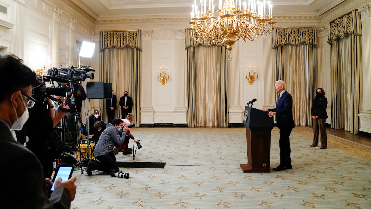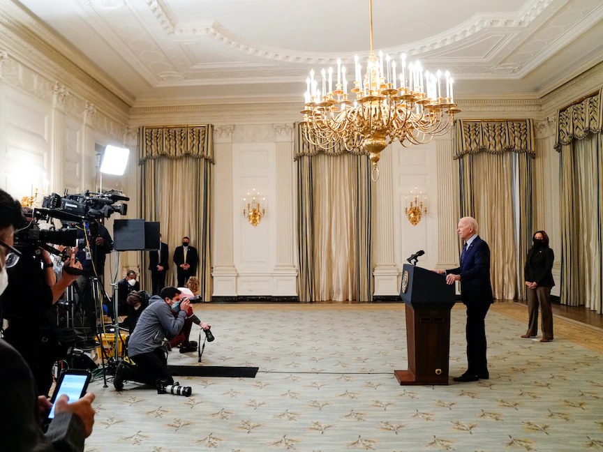الرئيس الأميركي جو بايدن خلال إفادة صحافية في البيت الأبيض - 6 مارس 2021 - REUTERS