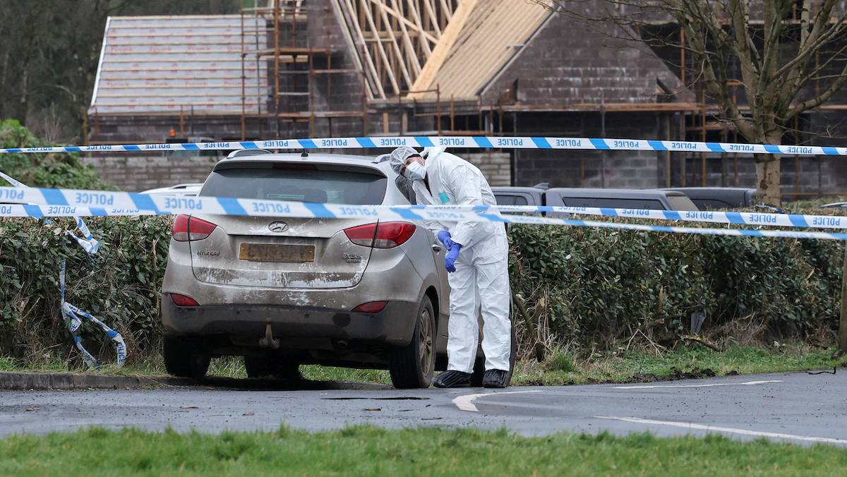 الطب الشرعي يفحص سيارة في موقع إطلاق النار على الشرطي جون كالدويل في بلدة أوماج، إيرلندا الشمالية. 23 فبراير 2023 - REUTERS