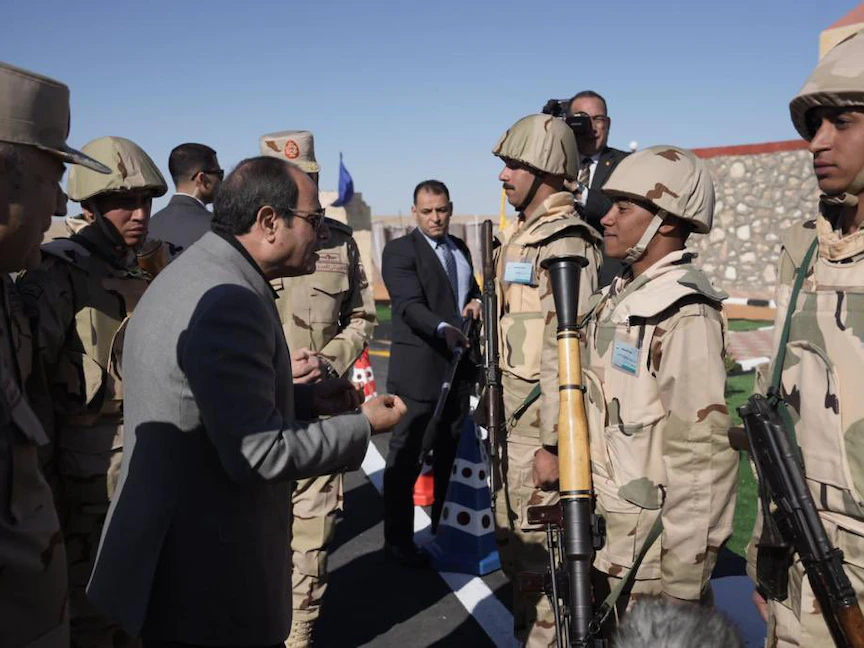 وتابع السيسي مخاطباً الجنود: "انتهى الإرهاب بكم.. والأزمة التي نعيشها حالياً ستكون تاريخاً"، وأشار إلى أن مصر "لن تنسى الثمن الكبير الذي دفعه الشهداء لأمن وأمان سيناء"، واصفاً القتال الذي شهدته سيناء في محاربة الإرهاب، "لا يقل عن القتال الذي شهدته مصر في حرب أكتوبر 1973".