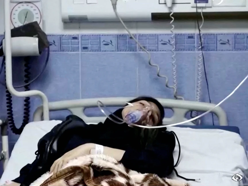 شابة ترقد في المستشفى بعد تقارير عن تسممها في مكان غير محدد في إيران في هذه الصورة الثابتة من مقطع فيديو. 2 مارس 2023. - REUTERS