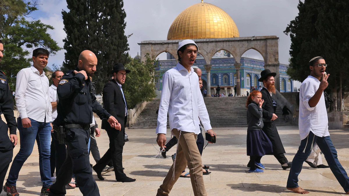 الشرطة الإسرائيلية ترافق مجموعة من اليهود أمام مسجد قبة الصخرة في حرم المسجد الأقصى في البلدة القديمة بالقدس- 5 مايو 2022 - AFP
