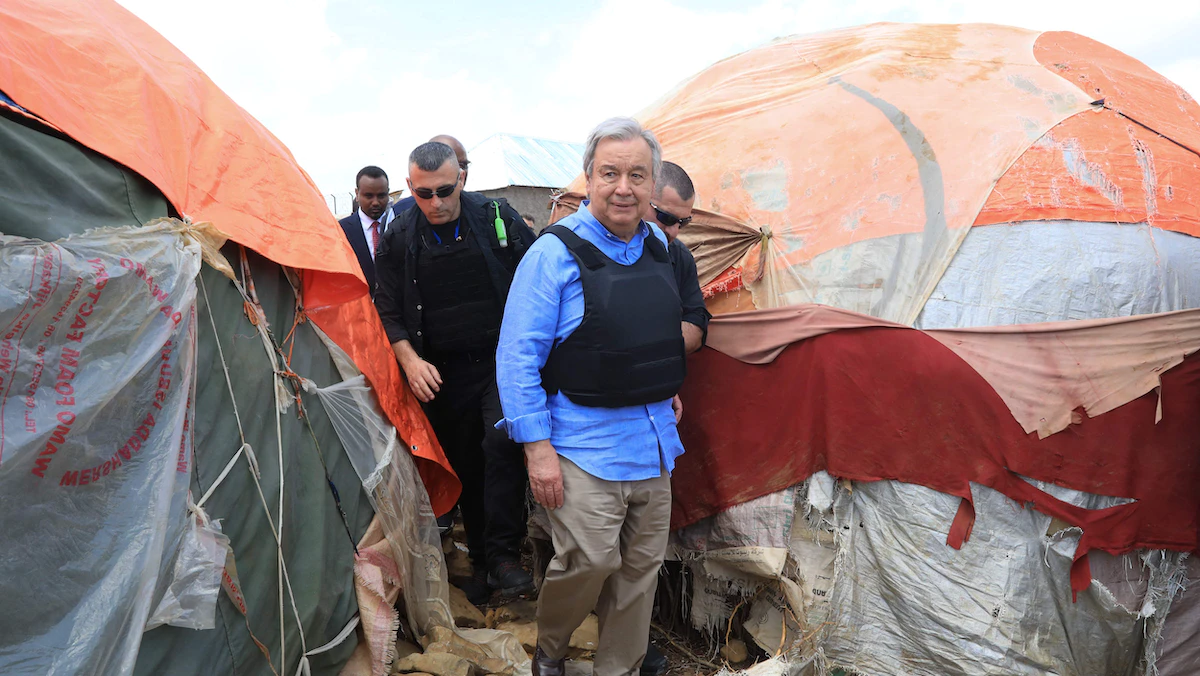 وتفقّد جوتيريش مخيّماً للنازحين يؤوي ضحايا الجفاف في منطقة تعد من الأكثر تضرراً من المجاعة، ومعقلاً لحركة "الشباب" المتشددة.