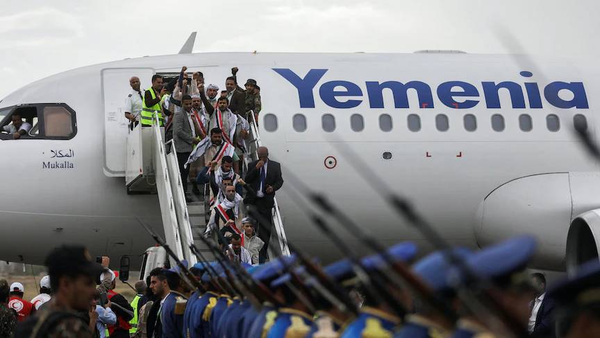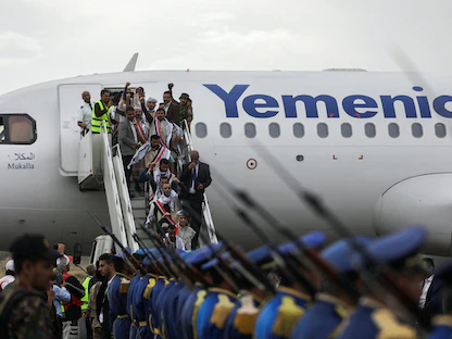 أسرى مفرج عنهم يصلون مطار صنعاء خلال عملية تبادل أسرى بين الأطراف اليمنية- 14 أبريل2023 - REUTERS