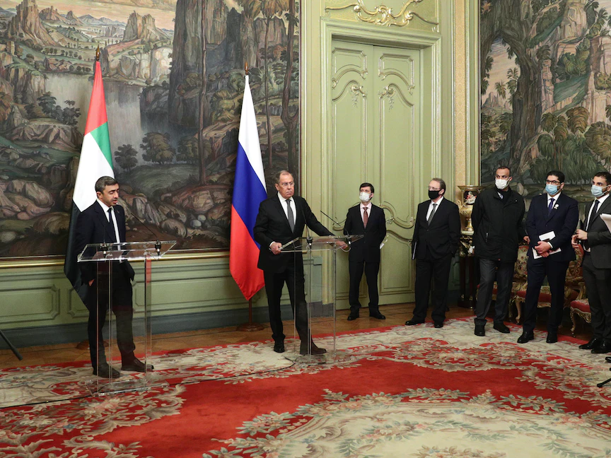 وأوضح وزير الخارجية الإماراتي، خلال مؤتمر صحافي مشترك مع نظيره الروسي سيرغي لافروف، الذي يزور أبوظبي، الثلاثاء، أن "عودة سوريا إلى جامعة الدول العربية في مصلحتها ومصلحة البلدان الأخرى في المنطقة"، مشدداً على ضرورة التعاون والعمل الإقليمي "لبدء مشوار عودة سوريا إلى محيطها".