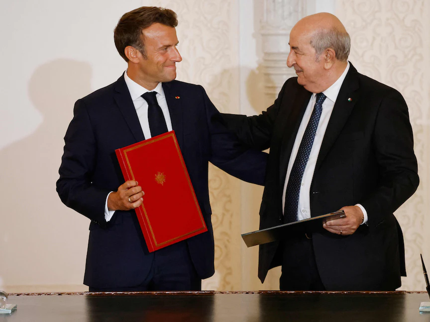الرئيس الجزائري عبد المجيد تبون مع نظيره الفرنسي إيمانويل ماكرون خلال توقيع اتفاق الشراكة المتجددة في الجزائر - 27 أغسطس 2022 - AFP