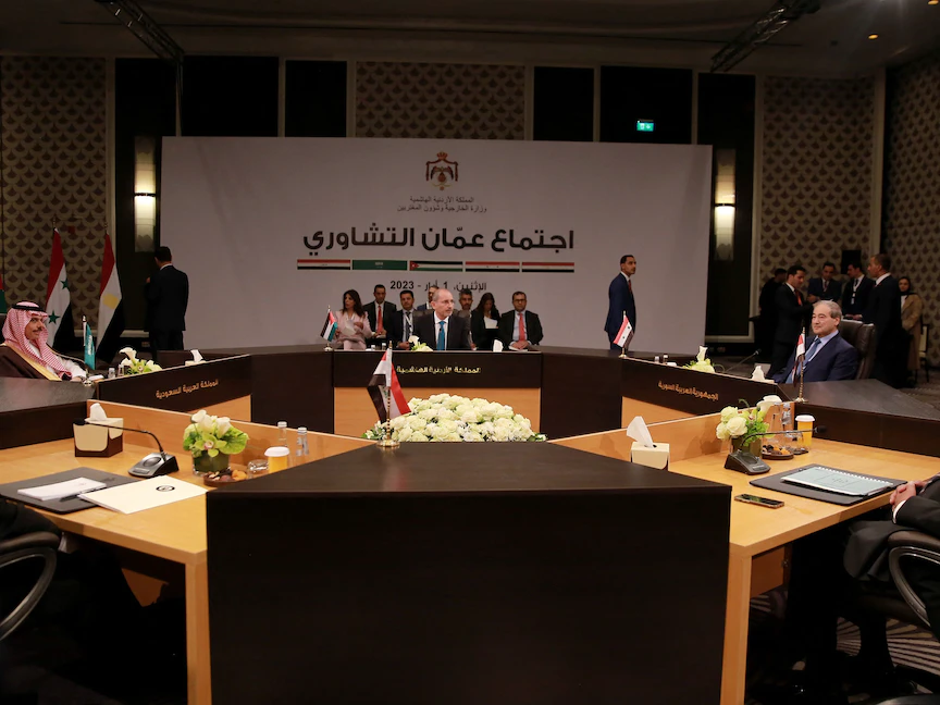 بدوره، ذكر وزير الخارجية الأردني أيمن الصفدي في مؤتمر صحافي بعد ختام أعمال الاجتماع التشاوري، أن الهدف من الاجتماع "استعادة سوريا لأمنها، واستقرارها، وعافيتها، ودورها الرئيس في المنطقة والعالم".
