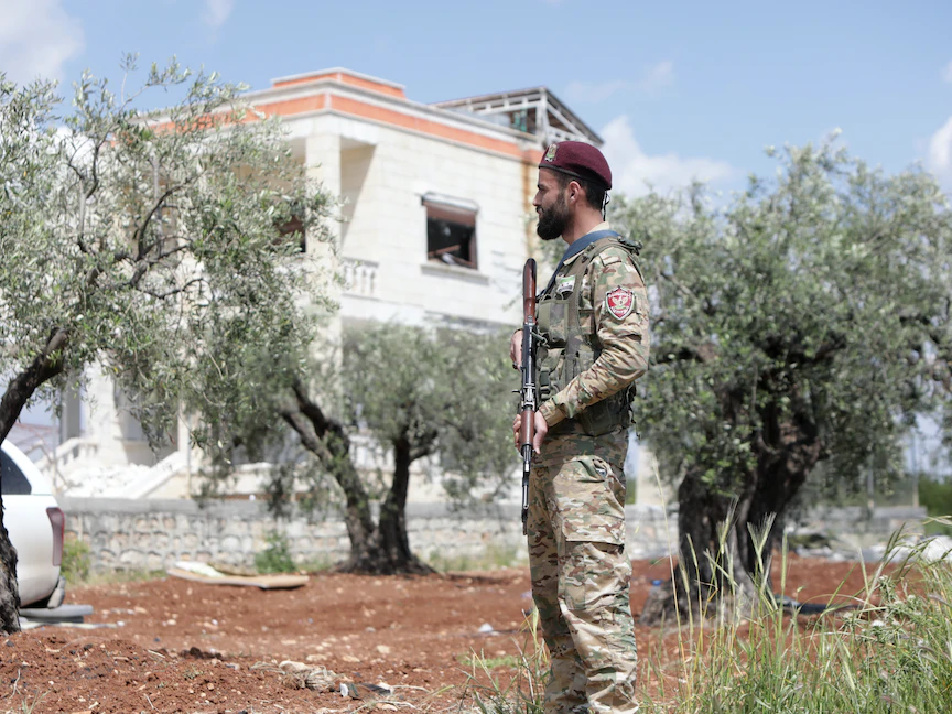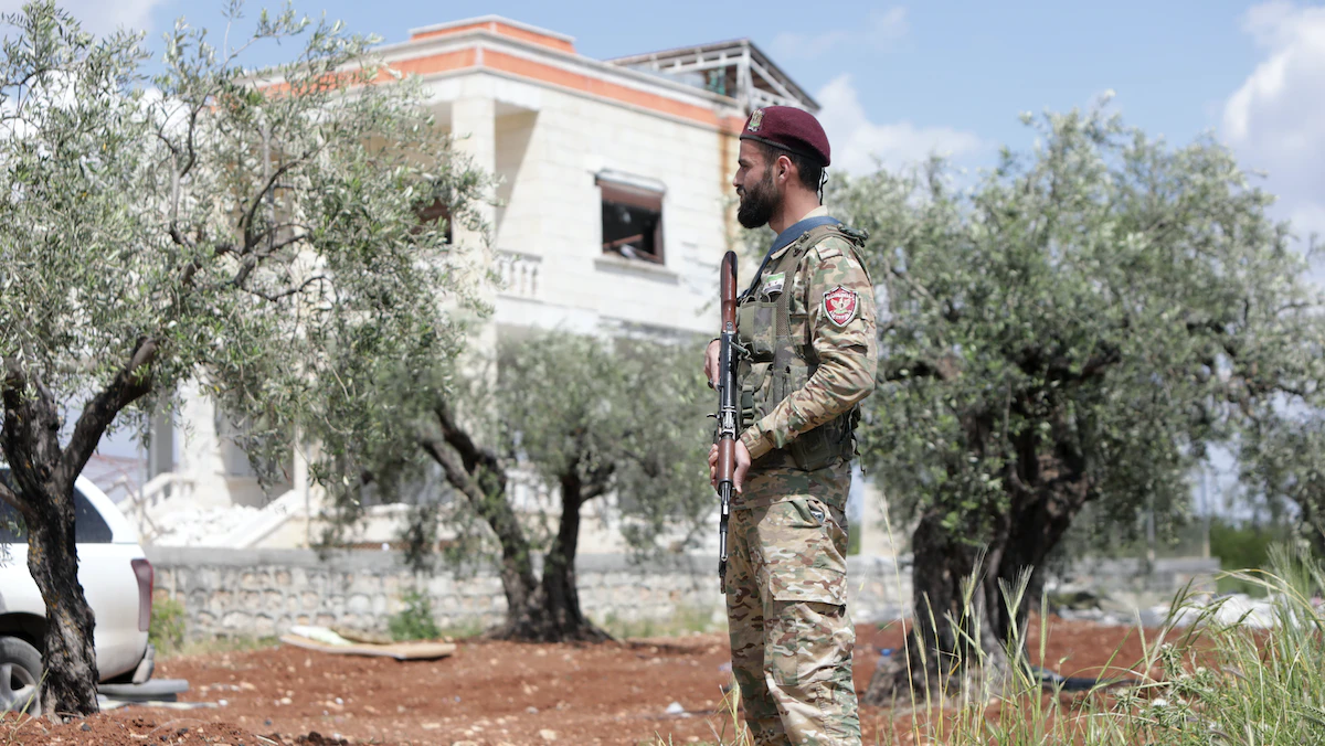 أحد أفراد الشرطة العسكرية المدعومة من تركيا يقف خارج منزل في جنديرس شمالي سوريا يعتقد أنه لزعيم تنظيم داعش أبو الحسين القرشي. 1 مايو 2023 - AFP