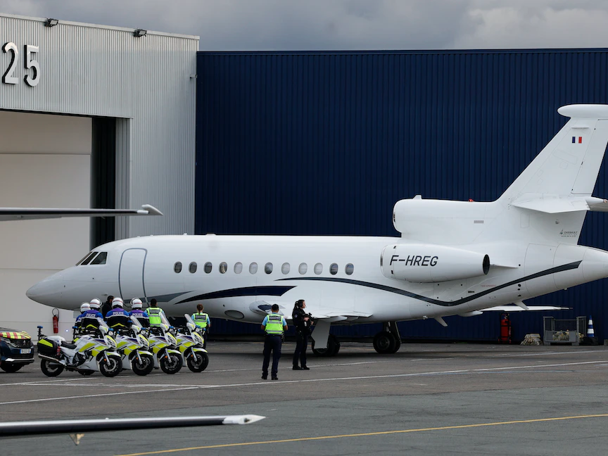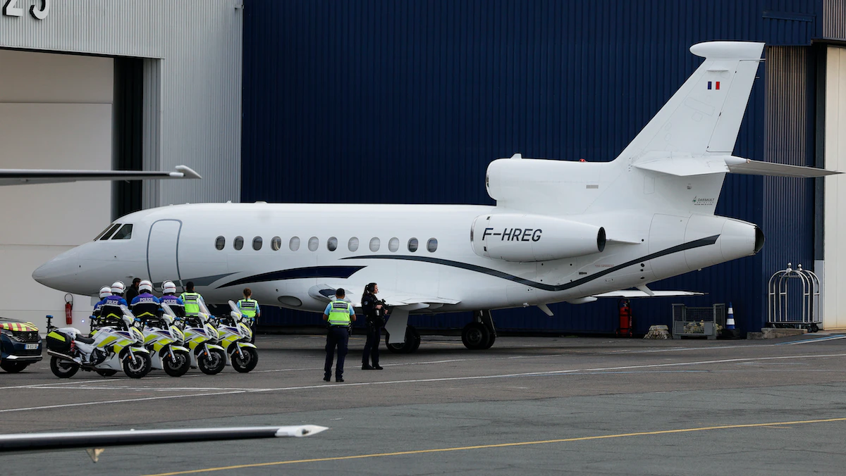 عناصر من الشرطة الفرنسية تقف بجانب طائرة تقل فرنسيان أفرجت إيران عنهما. باريس.12 مايو 2023 - AFP