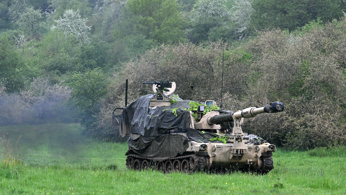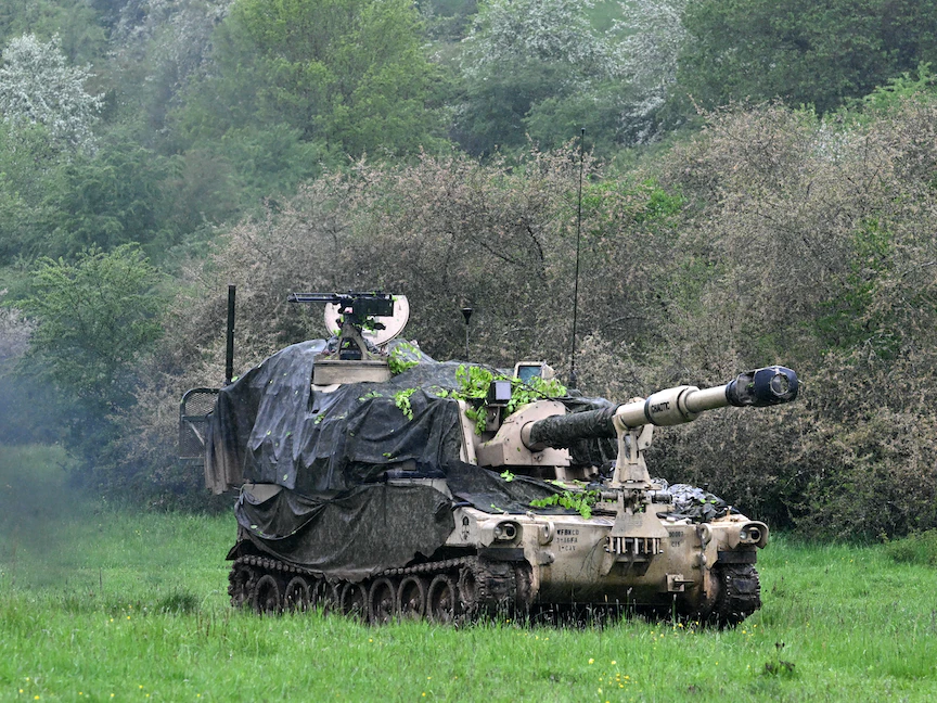 مدافع هاوتزر ذاتية الدفع من طراز M109 Paladin أثناء تمرين في منطقة هوهانفل بجنوب ألمانيا. 11 مايو 2023 - AFP