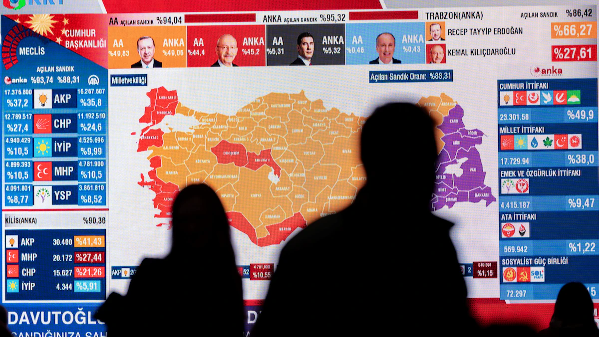 وحصل كيليجدار أوغلو على 44.88%، ما يعني فشل كليهما في الوصول إلى عتبة 50% من الأصوات، وتوجههما إلى جولة إعادة بعد أسبوعين.