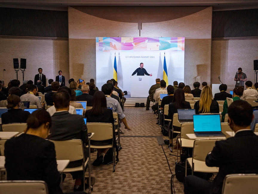 وأعادت زيارة زيلينسكي إلى المدينة التي دُمرت بقنبلة ذرية، وأصبحت منذ ذلك الحين رمزاً عالمياً للسلام، غزو أوكرانيا إلى صلب مناقشات مجموعة السبع، متجاوزة موضوعات أخرى للقمة مثل علاقات دول مجموعة السبع مع الصين.