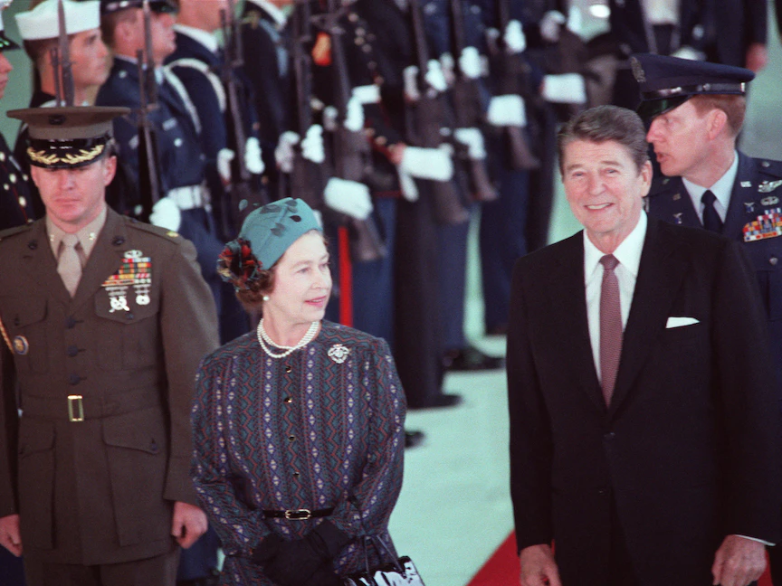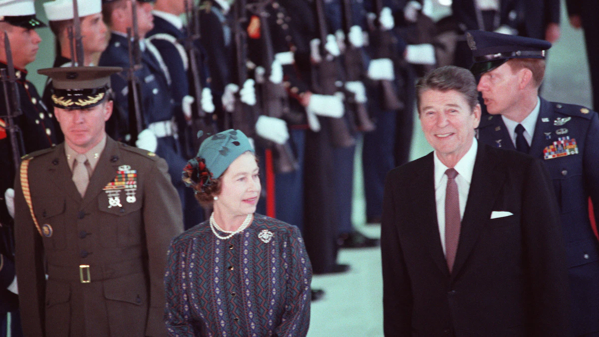 الرئيس الأميركي رونالد ريجان والملكة إليزابيث خلال زيارتها الساحل الغربي للولايات المتحدة بولاية كاليفورنيا. 23 فبراير 1983 - REUTERS