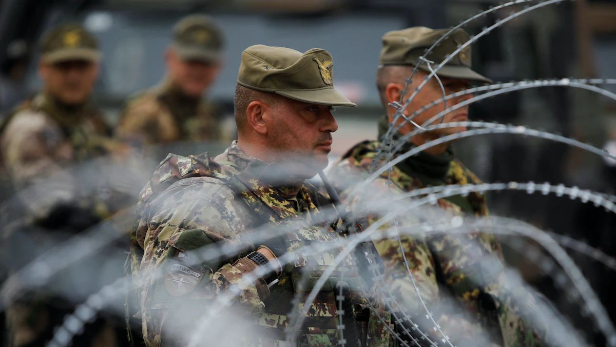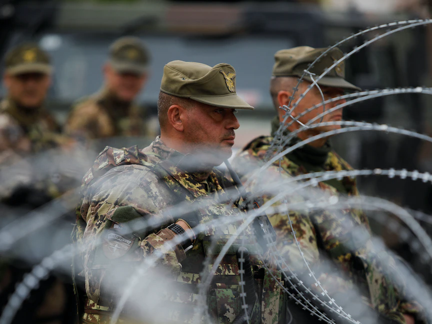 أعضاء من قوة حلف الناتو في كوسوفو يقفون خلف أسلاك شائكة في بلدة ليبوسافيتش شمالي البلاد. 1 يونيو 2023 - REUTERS