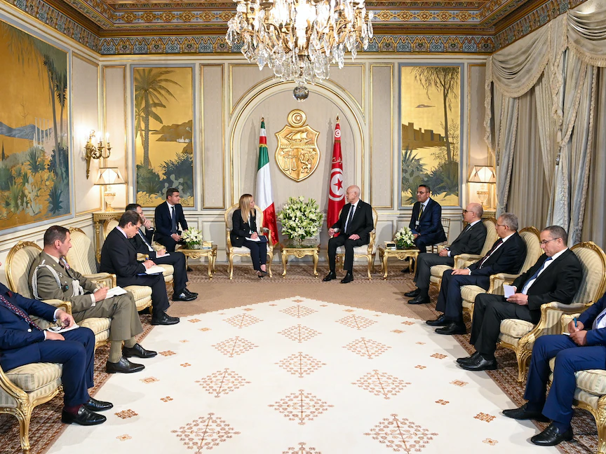 وجاء ذلك خلال زيارة ميلوني تونس، الثلاثاء، حيث اجتمعت مع الرئيس قيس سعيّد، وناقشت معه مساعي الحكومة التونسية للحصول على تمويل لدعم ماليتها العامَّة في ظل أزمة اقتصادية حادَّة، بالإضافة إلى الهجرة غير الشرعية.