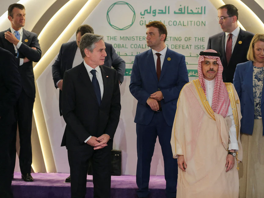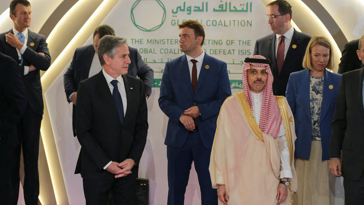 أكد وزير الخارجية السعودي الأمير فيصل بن فرحان، الخميس، مواصلة المملكة دعم جهود التحالف الدولي ضد تنظيم "داعش"، فيما تعهد نظيره الأميركي أنتوني بلينكن، بتخصيص 148.7 مليون دولار ضمن مساعي جمع 601 مليون دولار لتحقيق الاستقرار في سوريا والعراق، مشدداً على أن الحرب ضد التنظيم "لم تنته".