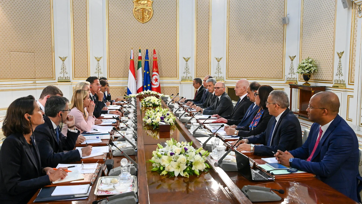 جاء ذلك خلال زيارة رئيس الوزراء الهولندي مارك روته، ورئيسة الوزراء الإيطالية جورجيا ميلوني، ورئيسة المفوضية الأوروبية أورسولا فون دير لايين التي قالت إنه "بالاضافة إلى التجارة والاستثمار سيساعد مبلغ بقيمة 100 مليون يورو تونس في مراقبة الحدود ومكافحة الاتجار بالبشر هذا العام".