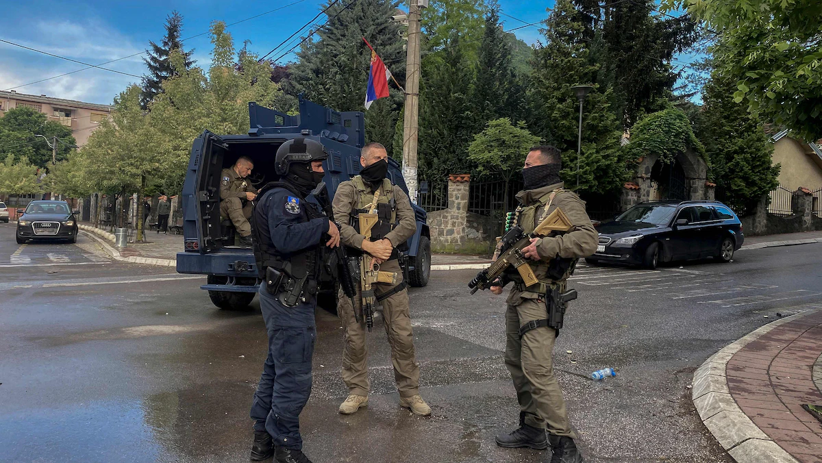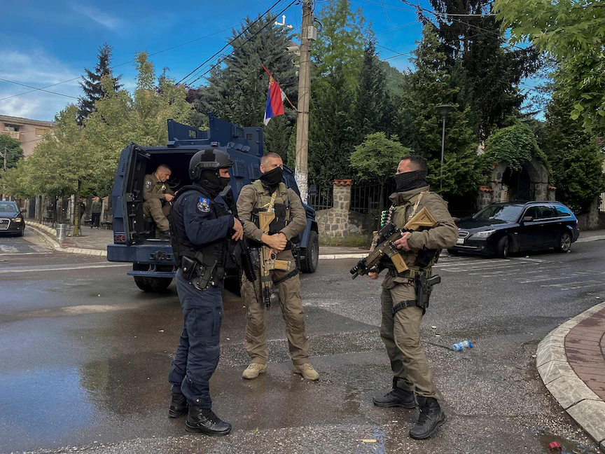عناصر من قوات الشرطة الخاصة بشمال كوسوفو خلال مواجهات مع متظاهرين من الأقلية الصربية. 26 مايو 2023 - AFP