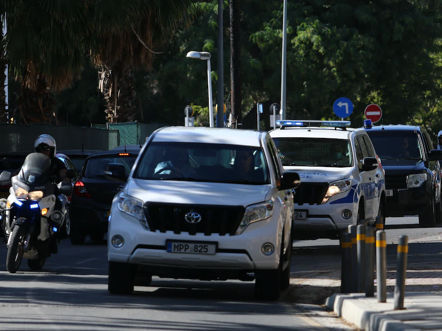 سيارات الشرطة تصل إلى المحكمة بعد حجز مشتبه به بالتخطيط لاستهداف إسرائيليين في نيقوسيا. 6 أكتوبر 2021 - REUTERS