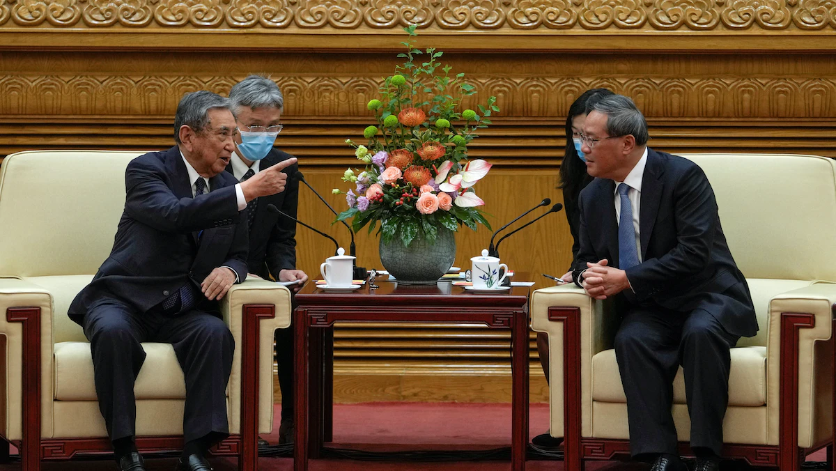 رئيس الرابطة اليابانية لتعزيز التجارة الدولية يوهي كونو مع رئيس مجلس الدولة الصيني لي تشيانج خلال اجتماع في بكين. 5 يوليو 2023. - via REUTERS
