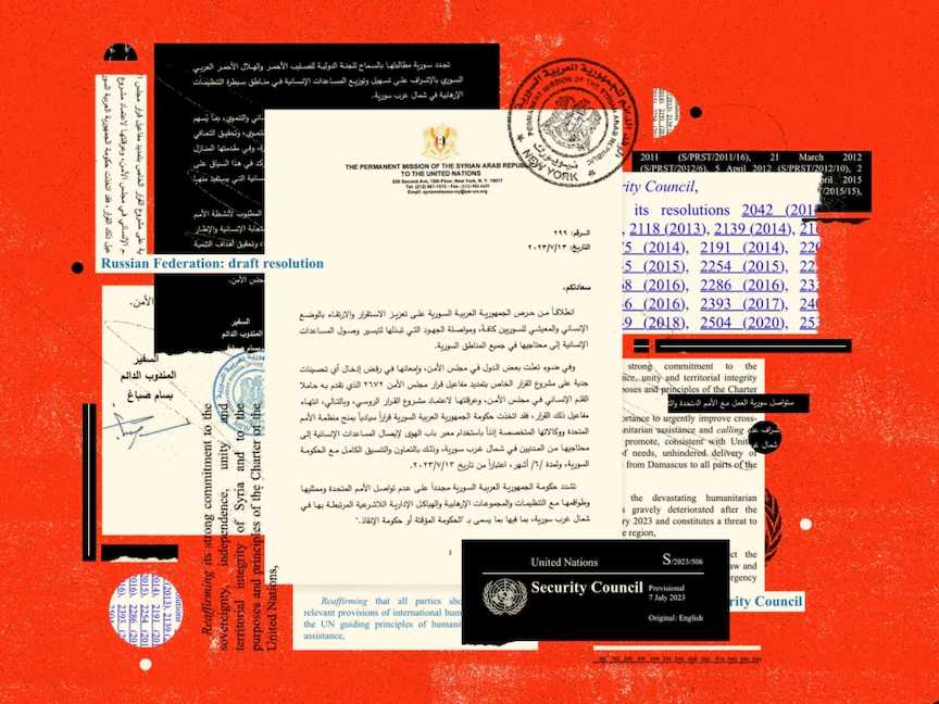 وفجأة، سلم مندوب سوريا إلى الأمم المتحدة بسام صباغ رسالة إلى مجلس الأمن. ونصت الرسالة، التي حصلت "المجلة"، على نصها، قرار دمشق فتح معبر باب الهوى دون ولاية أممية، لكن مع شروط كثيرة.