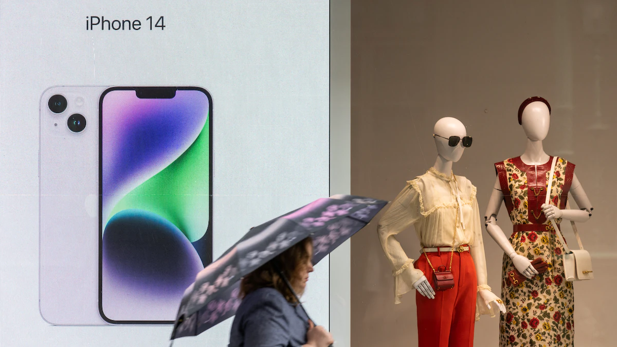 امرأة تحمل مظلة تسير أمام شاشة عرض تعلن عن هاتف "آيفون 14" في موسكو. 25 مايو 2023 - REUTERS