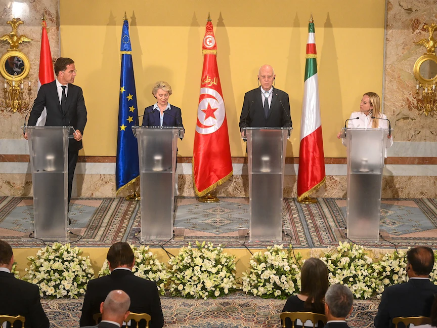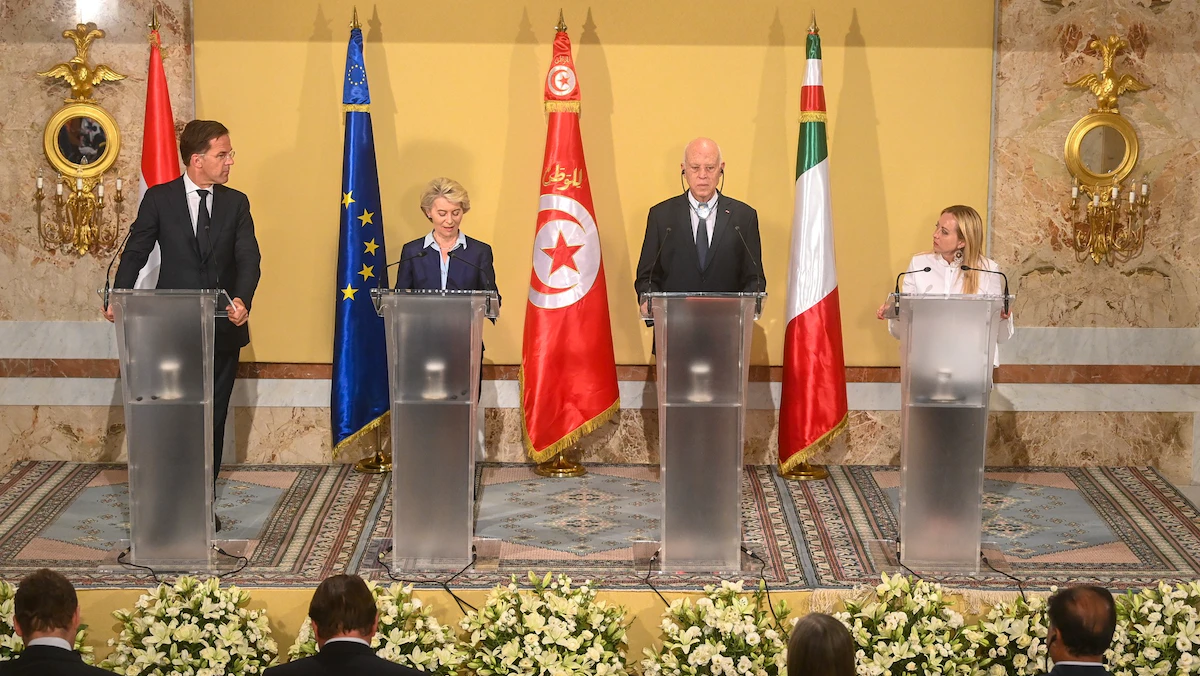 وفي مؤتمر صحافي بالعاصمة تونس، بمشاركة رئيسة المفوضية الأوروبية أورسولا فون دير لاين، ورئيسة الوزراء الإيطالية جورجيا ميلوني، ورئيس الوزراء الهولندي مارك روته، دعا الرئيس التونسي قيس سعيّد إلى "اتفاق جماعي" بشأن مكافحة الهجرة غير النظامية، والتي تقف وراءها "شبكات إجرامية"، بحسب تعبيره.