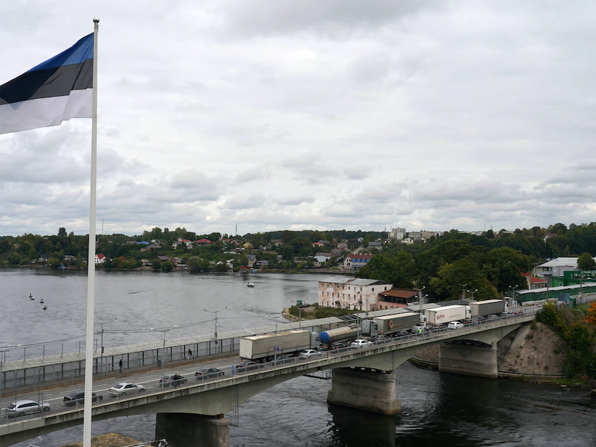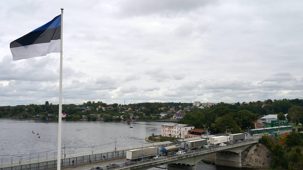 علم إستونيا عند نقطة العبور الحدودية مع روسيا في نارفا بإستونيا. 18 سبتمبر 2022 - REUTERS