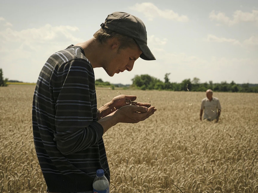 عامل مزرعة يتحقق من محتوى رطوبة الحبوب خلال موسم حصاد القمح الصيفي في منطقة فاستيف بأوكرانيا. 24 يوليو 2023 - Bloomberg