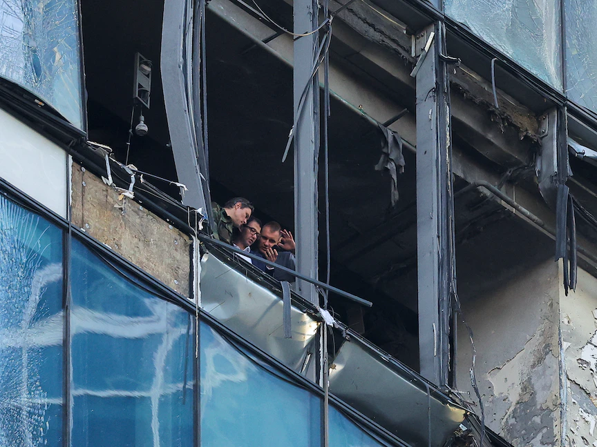ونشر زيلينسكي مقطع فيديو يُظهر دخاناً متصاعداً من فجوة في جانب مبنى سكني من تسعة طوابق، ومبنى آخر من أربعة طوابق سوي بالأرض، وقال إن الضربات أصابت مبنى سكنياً وآخر جامعياً.