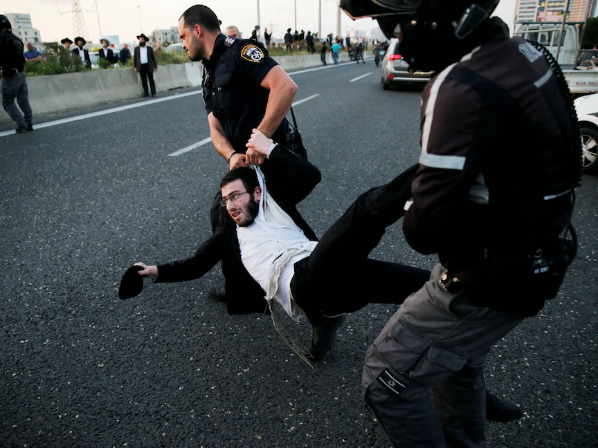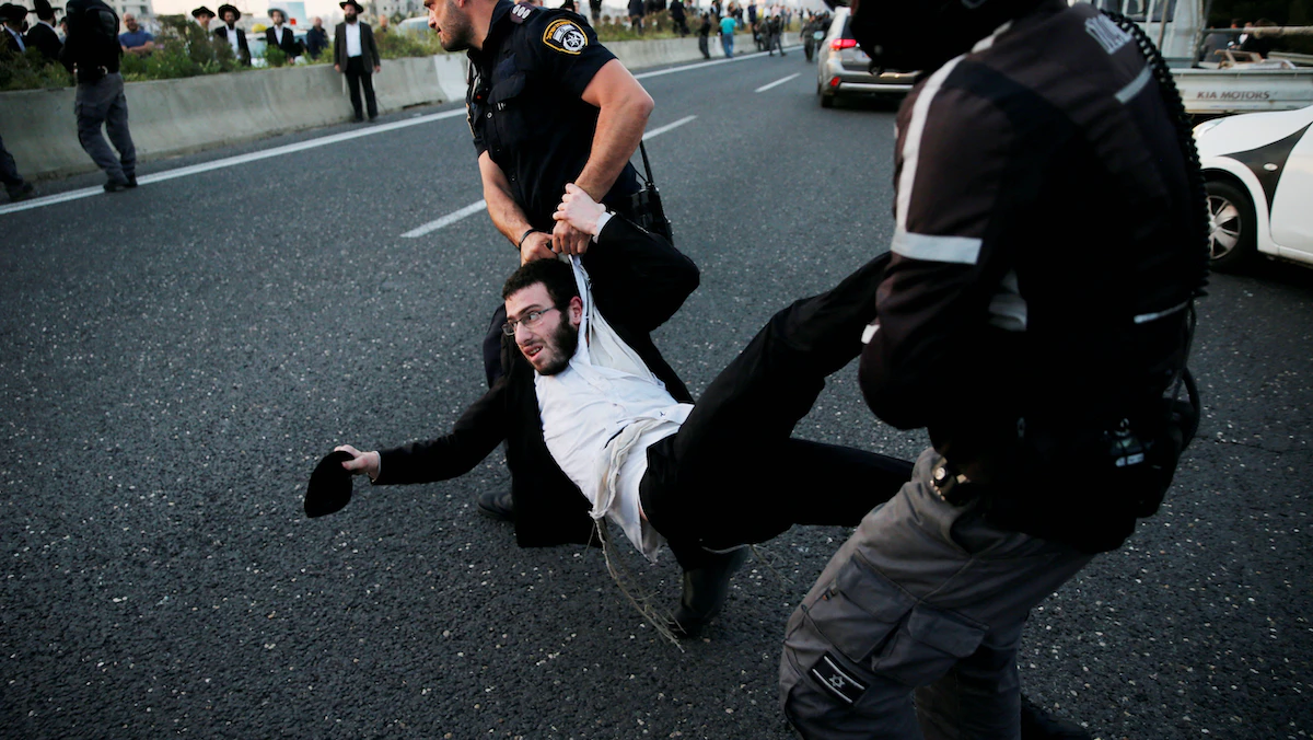 عناصر من الأمن يجرون أحد أتباع طائفة الحريديم في إسرائيل خلال فض تظاهرة للطائفة في بني براك بإسرائيل، 12 مارس 2018   - REUTERS