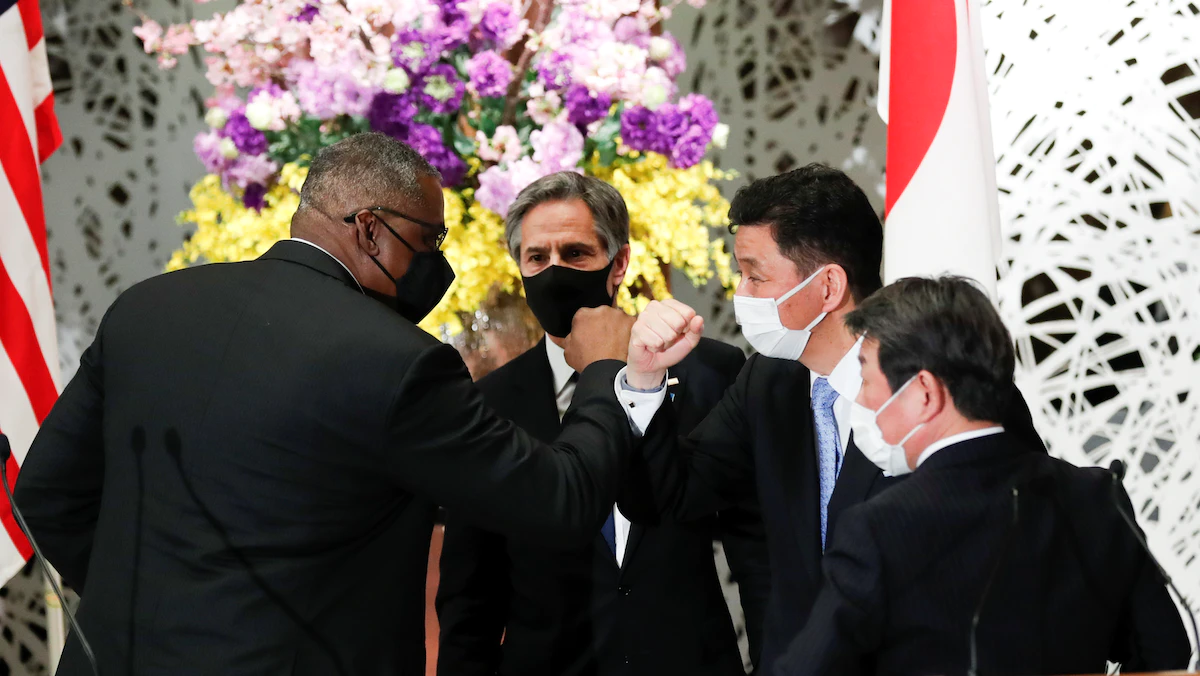 وزير الخارجية الأميركي أنتوني بلينكن، ووزير الدفاع لويد أوستن، مع وزير الخارجية الياباني توشيميتسو موتيغي، ووزير الدفاع نوبو كيشي - طوكيو - 16 مارس 2021 - REUTERS