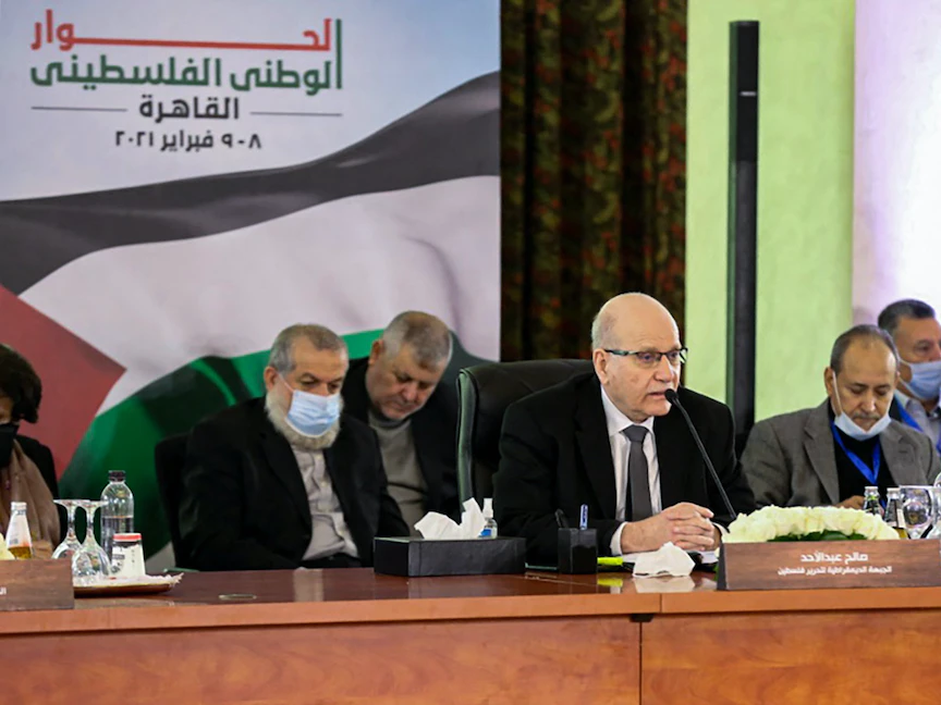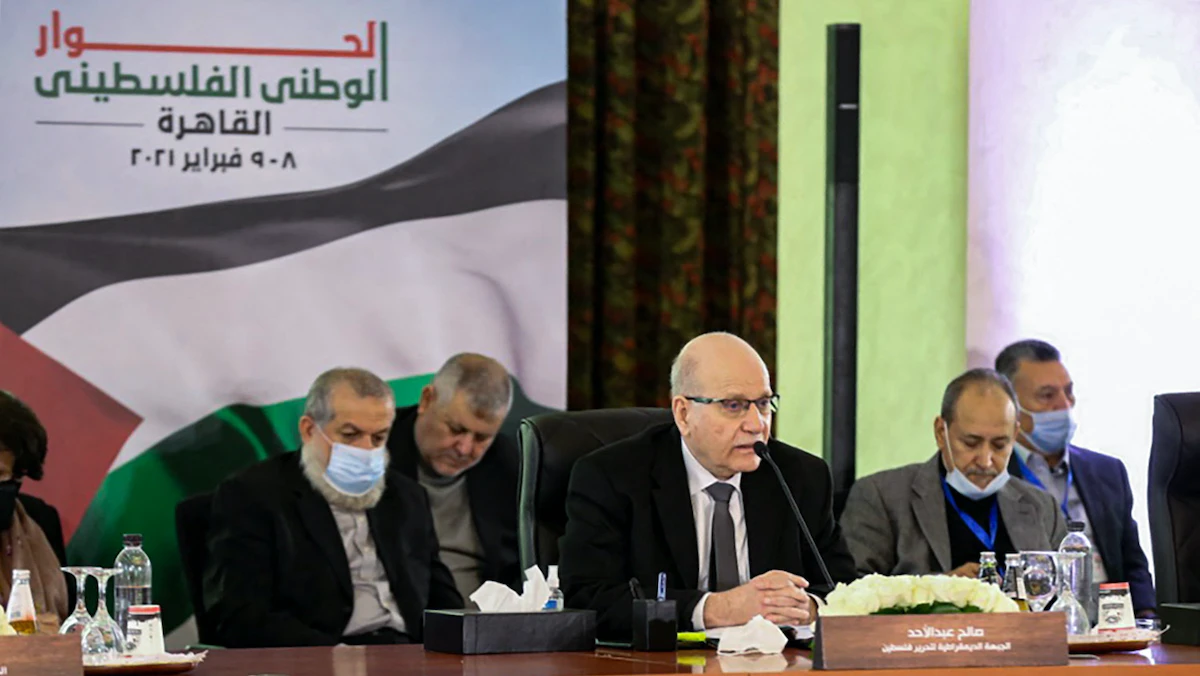 وفد الجبهة الديمقراطية لتحرير فلسطين خلال الحوار الوطني الفلسطيني في القاهرة - 8 فبراير 2021 - AFP