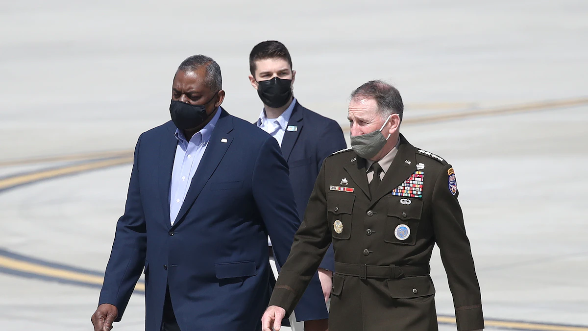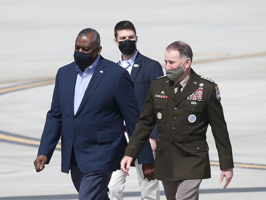 وزير الدفاع الأميركي لويد أوستن إلى جانب  الجنرال روبرت أبرامز، بعد وصوله قاعدة أوسان الجوية في بيونجتايك بكوريا الجنوبية-  17 مارس 2021 - REUTERS