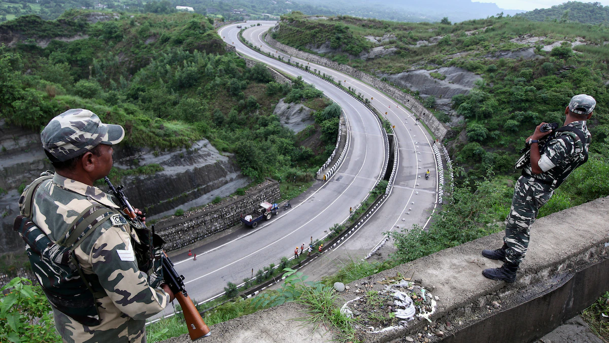 رجال أمن هنود يقفون في الحراسة على طريق جامو - سريناغار السريع في ناغروتا بالقرب من جامو - 14 أغسطس 2019 - AFP