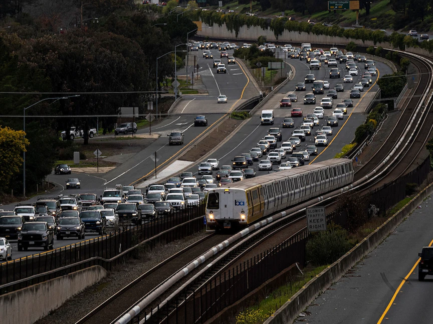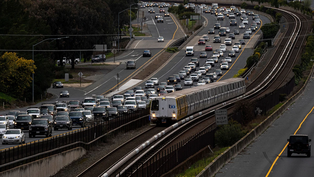 قطار نقل وسيارات على طريق سريع في كاليفورنيا - 17 مارس 2021 - Bloomberg