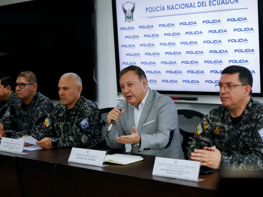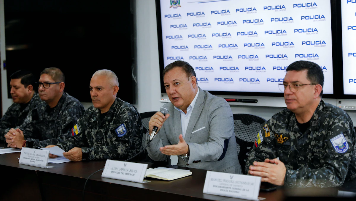 وزير الداخلية الإكوادوري خوان زاباتا سيلفا يحضر مؤتمراً صحافياً بشأن اغتيال المرشح الرئاسي الإكوادوري الراحل فرناندو فيلافيسينسيو، الإكوادور. 13 أغسطس 2023 - REUTERS
