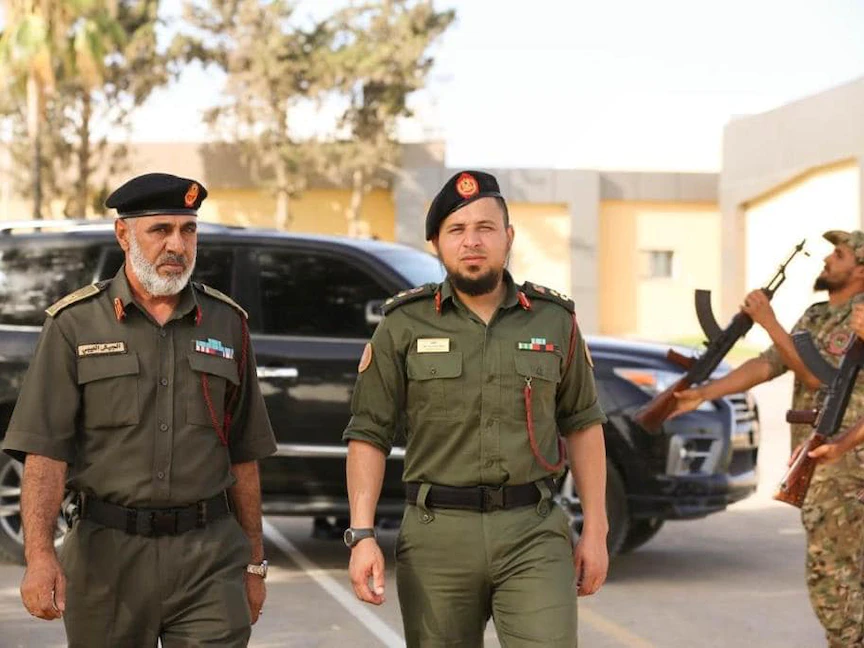 محمود حمزة (يمين) في معسكر التكبالي بمدينة طرابلس قبل حفل تخريج الدّفعة الخامسة من منتسبي اللواء 444 قتال. 23 يوليو 2023 - Facebook/Unit444ly