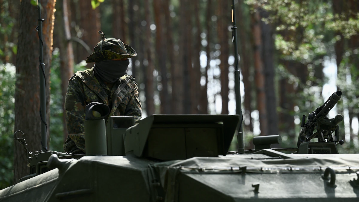 جندي أوكراني أعلى دبابة من طراز Leopard 1A5 في منطقة كليتز الألمانية. 17 أغسطس 2023 - REUTERS