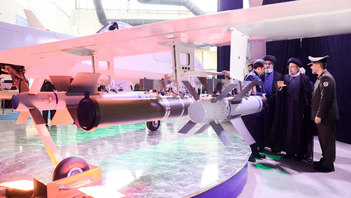 الرئيس الإيراني إبراهيم رئيسي بجانب طائرة مسيرة تحمل اسم "مهاجر 10" في معرض أحدث الإنجازات التكنولوجية والمتقدمة الإيرانية المقام في طهران. 22 أغسطس 2023 - via REUTERS