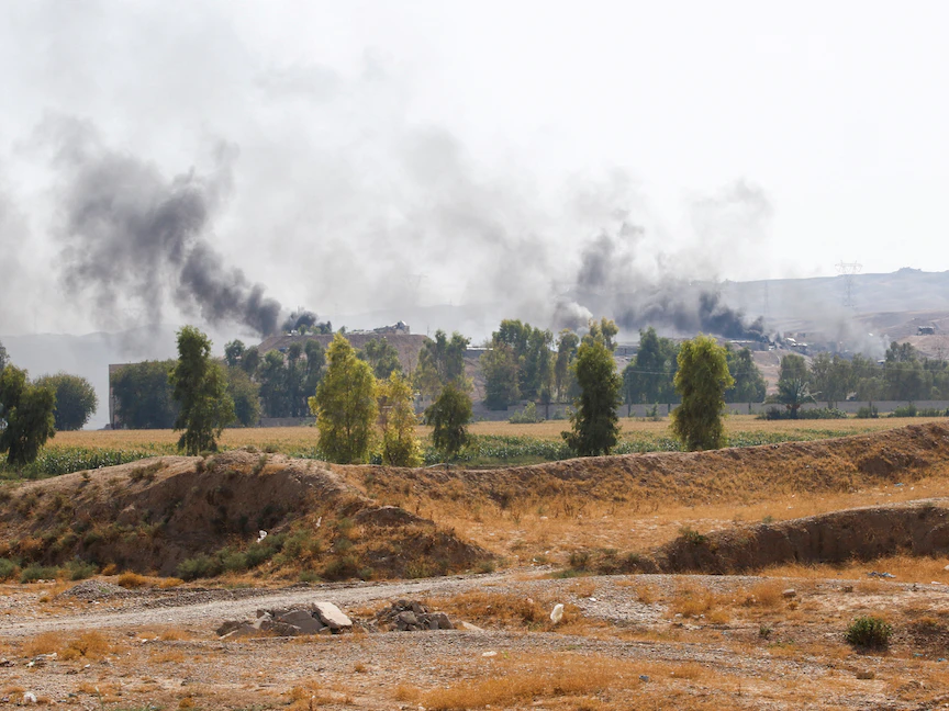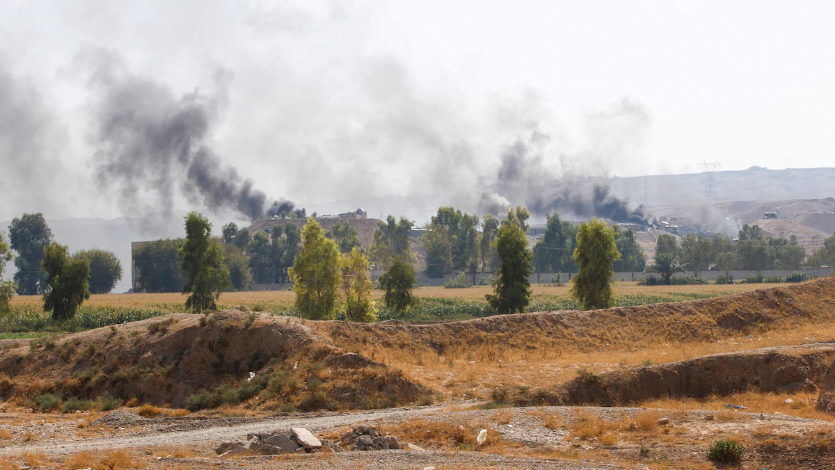 دخان يتصاعد من مقر حزب الحرية الكردستاني في كردستان العراق، بعد ضربة الحرس الثوري الإيراني على مشارف مدينة كركوك. 28 سبتمبر 2022 - REUTERS