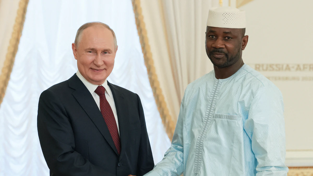 الرئيس الروسي فلاديمير بوتين يصافح رئيس مالي أسيمي جويتا خلال اجتماع عقب القمة الروسية الإفريقية في سانت بطرسبرج، روسيا، 29 يوليو 2023 - REUTERS