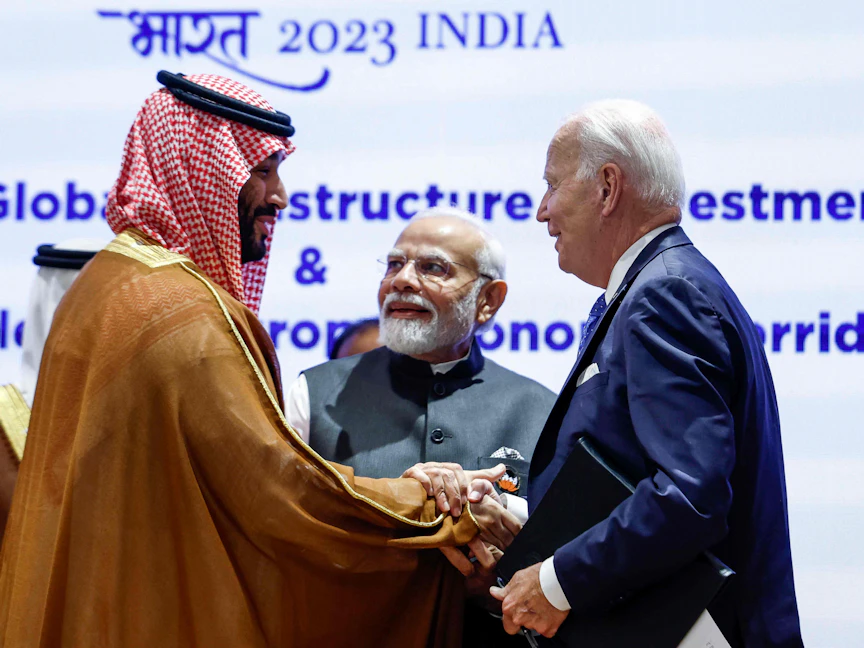 أعلن قادة الولايات المتحدة والسعودية والهند والإمارات وفرنسا وألمانيا وإيطاليا والاتحاد الأوروبي، السبت، توقيع مذكرة تفاهم للعمل معاً على تطوير ممر اقتصادي جديد يربط الهند والشرق الأوسط وأوروبا، وذلك على هامش اجتماعهم في قمة العشرين.