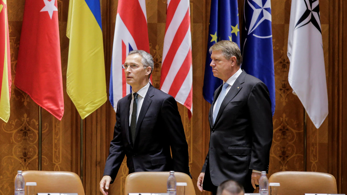 الرئيس الروماني كلاوس يوهانيس مع الأمين العام لحلف شمال الأطلسي ينس ستولتنبرج - REUTERS