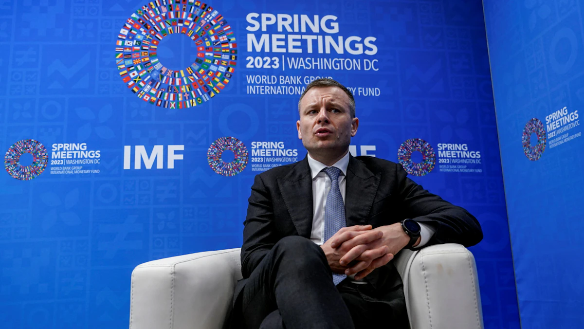 وزير المالية الأوكراني سيرهي مارشينكو يتحدث خلال لقاء في مقر صندوق النقد الدولي في واشنطن. 15 أبريل 2023 - REUTERS