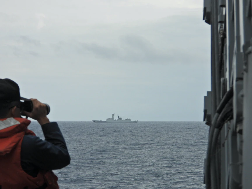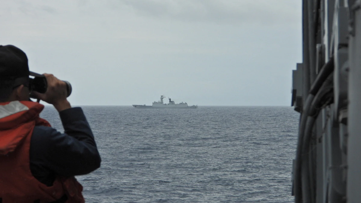 بحار يراقب فرقاطة بحرية تابعة للجيش الصيني بالقرب من تايوان. 20 أغسطس 2023 - REUTERS