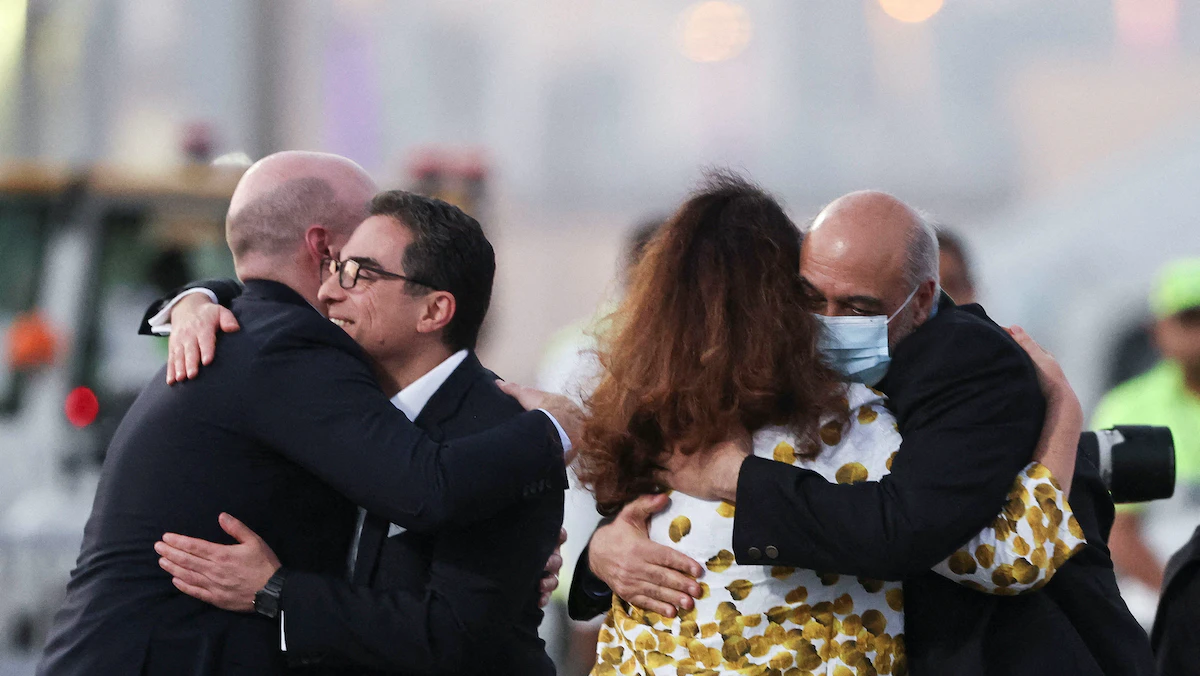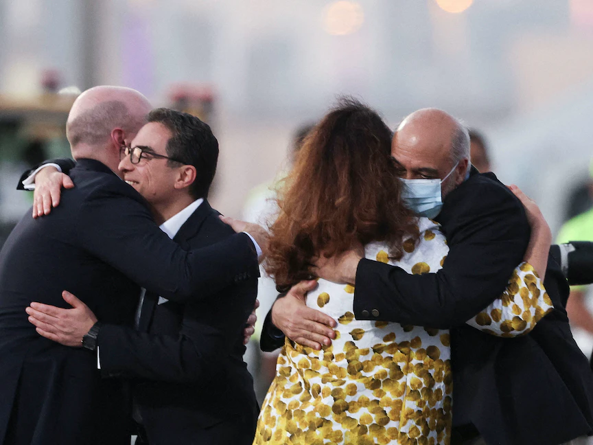 الأميركيان سياماك نمازي ومراد طاهباز، اللذان تم إطلاق سراحهما خلال صفقة تبادل الأسرى بين الولايات المتحدة وإيران، يصلان إلى مطار الدوحة الدولي، قطر. 18 سبتمبر 2023 - REUTERS