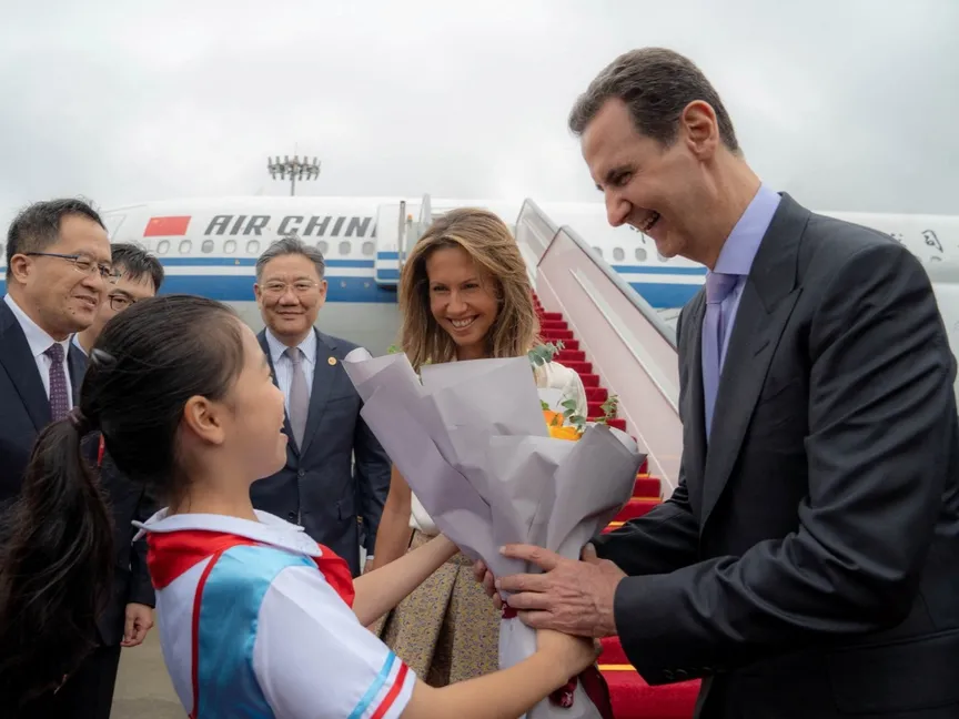 الرئيس السوري بشار الأسد وقرينته أسماء الأسد لدى وصولهما مطار بكين الدولي في الصين. 21 سبتمبر 2023 - Reuters