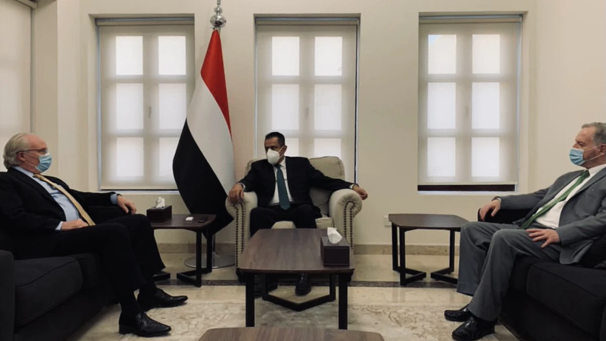 المبعوث الخاص إلى اليمن تيم ليندركينغ خلال لقائه رئيس الوزراء اليمني معين عبد الملك - twitter.com/StateDept_NEA