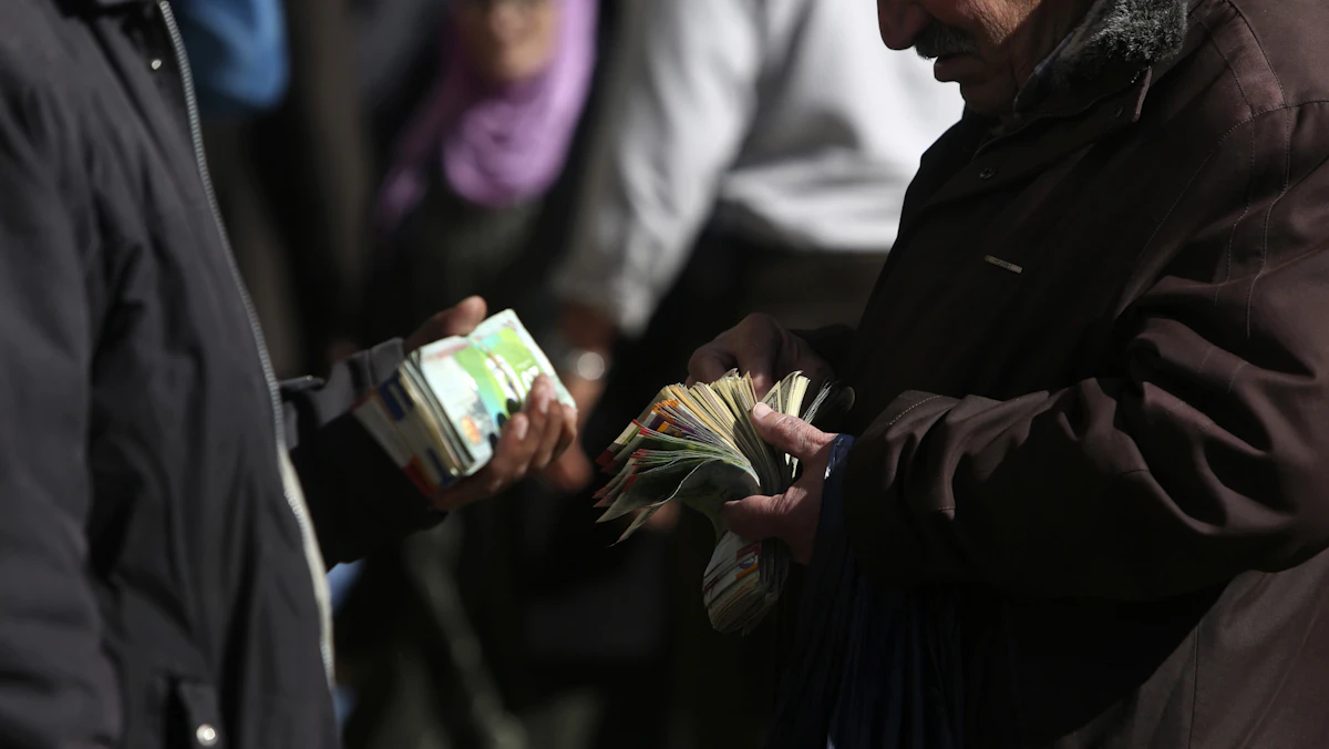 فلسطينيان يتبادلان الأموال في رام الله بالضفة الغربية - REUTERS